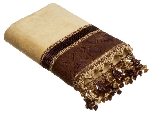 - Luxurious gold-toned towel embellished with multicolor fringe and bands of woven jacquard