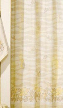 - Coastal design fabric shower curtain featuring seasghells and rippled water in pastel colors on a beige background.