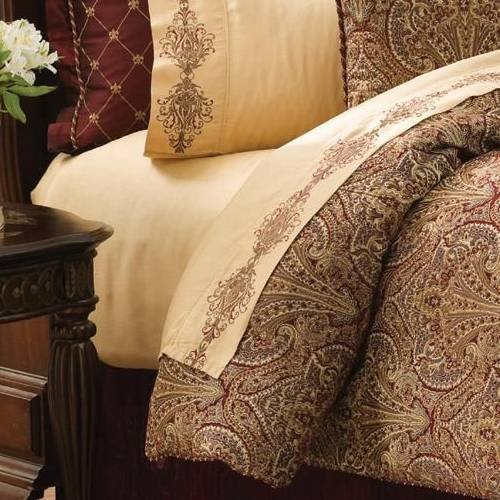 Croscill's Premier bedding ensemble radiates opulence, transforming your space into a royal sanctuary. A golden paisley pattern is woven upon this vivid ruby quilted comforter—fully embellished with bells and whistles of the plenty; including printed reverse, twist cord trim and removable corner tassels. Coordinating shams match the comforter face and feature a printed reverse. The bed skirt features a stylish vertical crush fabric in solid burgundy with corner kick pleats. Euro shams are burgundy with golden embroidery, twist cord trim and pleated flange, reversing to the same unique vertical crush solid as seen in the bed skirt. The square pillow coordinates back to the shams and comforter with the same woven paisley pattern, featuring an added embellishment of twist cord trim. The fashion pillow is solid burgundy and coordinates back to the euro shams with golden diamond embroidery and twist cord trim. A velvet boudoir pillow of solid gold adds a sassy flare to the collection, with luxurious feathered diamond embroidery. Complete the ensemble by adding sheets of solid gold with coordinating medallion embroidered hem. Complete the collection with coordinating Premier tailored window panels, tie backs and Lafayette valance! Premier panels feature coordinating woven paisley pattern. The Lafayette valance coordinates with the premier collection, further embellished with a beaded tassel fringe.