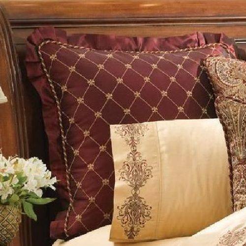 - Euro shams are burgundy with golden embroidery twist cord trim and pleated flange reversing to the same unique vertical crush solid as seen in the bed skirt